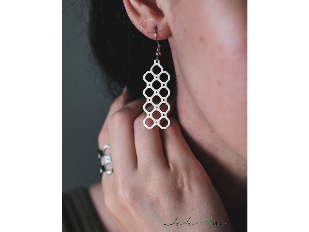 Náušnice Folklor Short pětiúhelník podlouhlý z nerezové oceli, jemný design, polomatný povrch. Dekor velký, háček z chirurgické oceli, jištění silikonovou zarážkou. Údržba šperku je velmi snadná.